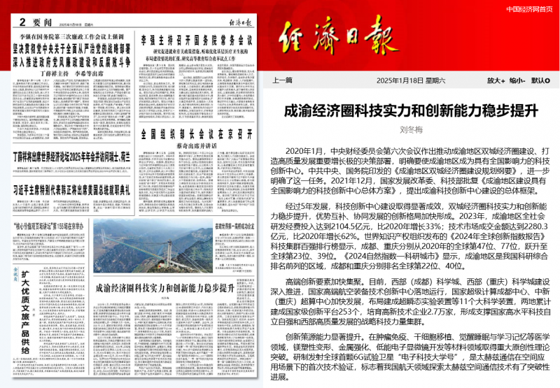 经过5年发展,科技创新中心建设取得显著成效,双城经济圈科技实力和创新能力稳步提升,优势互补、协同发展的创新格局加快形成。2023年,成渝地区全社会研发经费投入达到2104.5亿元,比2020年增长33%;技术市场成交金额达到2280.3亿元,比2020年增长62%。世界知识产权组织发布的《2024年全球创新指数报告》科技集群百强排行榜显示,成都、重庆分别从2020年的全球第47位、77位,跃升至全球第23位、39位。《2024自然指数—科研城市》显示,成渝地区是我国科研综合排名前列的区域,成都和重庆分别排名全球第22位、40位。